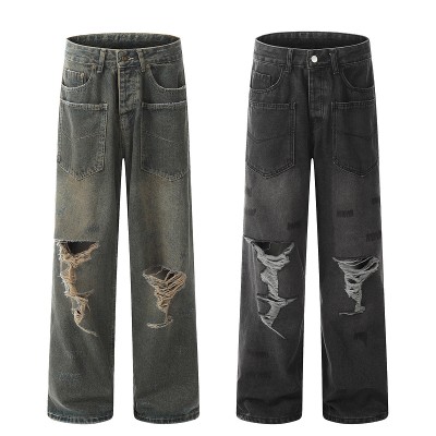 Summer new men's fashion trend American casual ripped wide leg denim pants