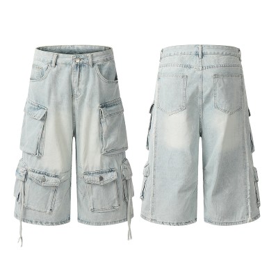 2025 summer new American retro multi pocket washed workwear denim shorts