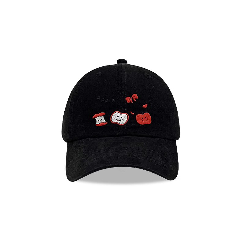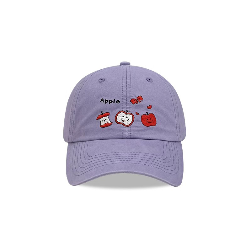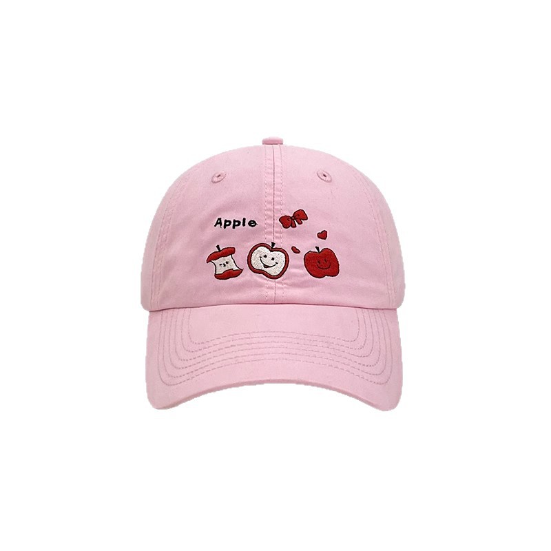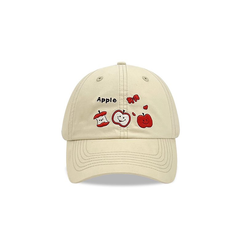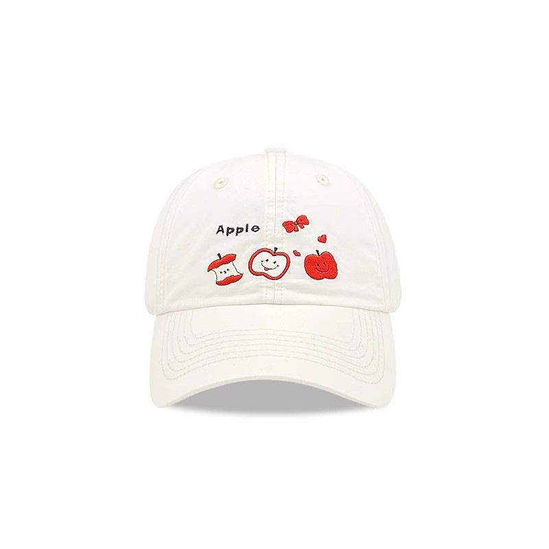 This white baseball cap features adorable embroidered red apples and bows, paired with "Apple" text and motifs. The minimalist yet whimsical design exudes youthful energy, perfect for casual styling.